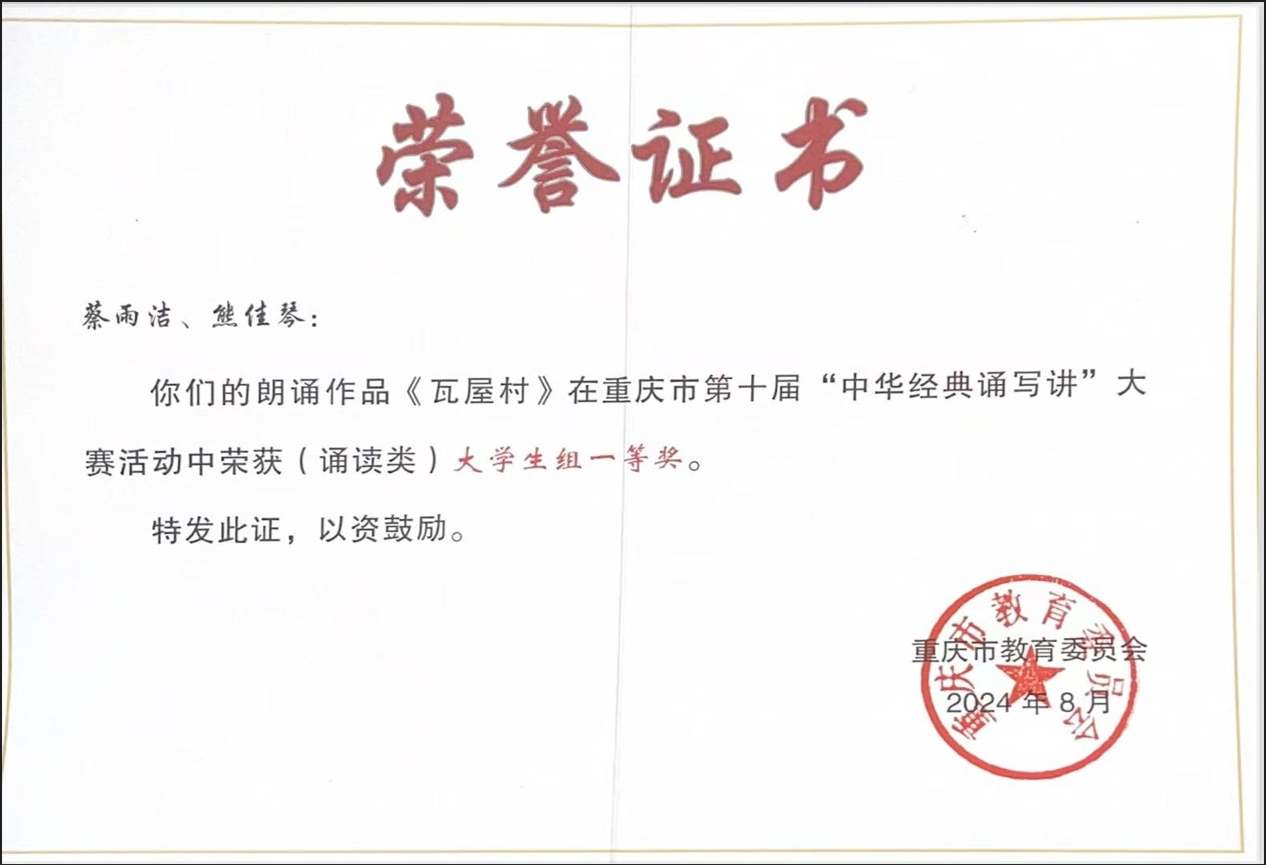 2024年8月,由重庆市教育委员会、重庆市语言文字工作委员会主办的第十届重庆市中华经典诵写讲大赛落下帷幕。漫蛙漫画 选送三部作品,分别是播音与主持系2022级学生蔡雨洁、熊佳琴创作的作品《瓦屋村》,2022级学生朱晨曦、高骏渝、官新翔的作品《登上地球之巅》和2023级学生邹佳益、黄圣植的作品《不朽的雕像》喜获佳绩,均获重庆市第十届重庆市中华经典“诵写讲”大赛(诵读类)大学生组一等奖。