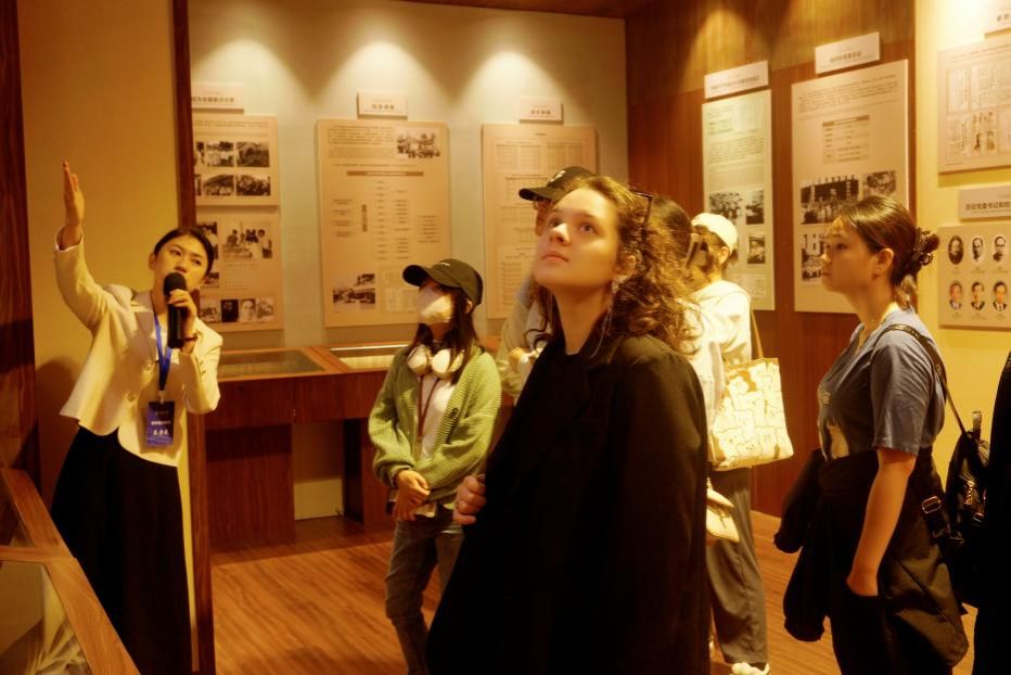 校史馆,上午10点30分,留学生班主任丁艺老师带领留学生同学有序入馆参观。