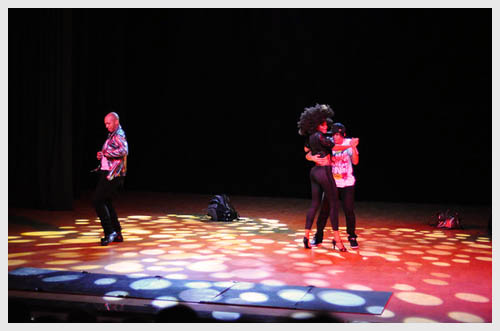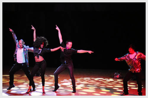 随后,“舞动美国”代表团奉献出了他们精彩演出。晚会舞台采用毫无装饰的裸台表现形式,他们将迪斯科、嘻哈、拉丁舞、踢踏舞和吉特巴舞组成一系列趣味十足、生动活泼的表演,以众多美国经典的舞蹈风格讲述了美国不同年代的发展历史和不同美国城市的文化背景故事,加上目不暇接的舞台服装,让观众有种穿越时空的错觉,仿佛身临其境目睹美国的往日风采。尽管语言不通,但舞蹈是能够超越所有语言和文化界限的艺术形式。舞蹈《舞动美国》以如火如荼的舞蹈语言、强烈奔放的节奏、精湛的舞艺,引发了台下同学们不息的掌声和喝彩,通过富有激情的舞台演绎,感染和带动了现场所有的观众,现场气氛热情洋溢。中场休息时,还举行了有奖问答,美国朋友为回答正确的重大同学赠送礼物。不仅增加了学生们对美国文化的了解,增进了中美之间的友谊和文化交流,同时也给漫蛙漫画