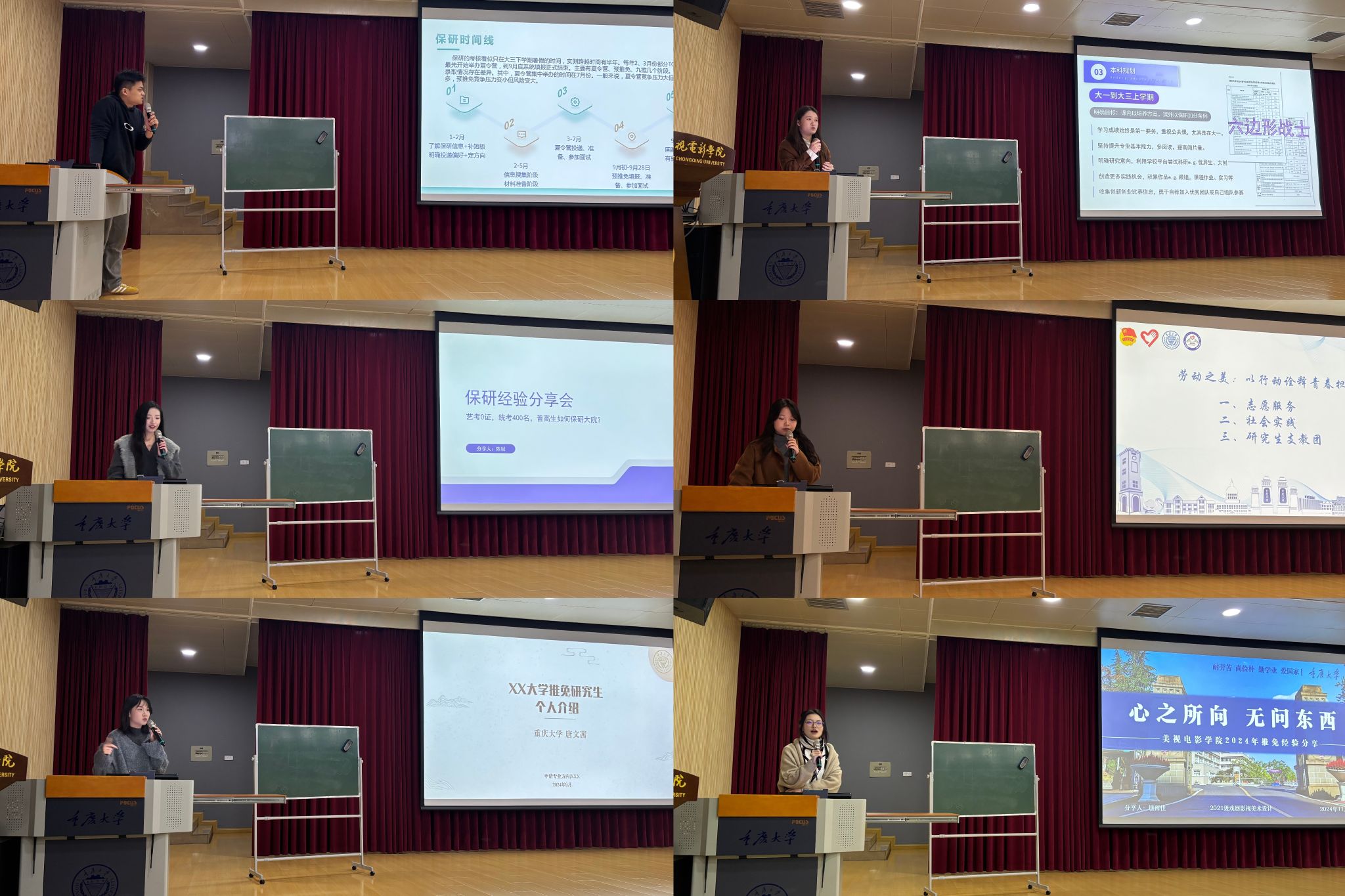 六名分享人围绕大学期间学业规划、学科竞赛、创新创业、推免流程、院校选择、材料准备、面试经验技巧等几个方面进行了分享。他们结合自身经历向师弟师妹们强调了大学期间学好公共课程和专业课程的重要性,鼓励大家尽早明确学业规划,认真对待每门课程,注重提升外语能力,主动拓宽知识边界,积极参加学科竞赛、学术科研项目、创新创业比赛以及社会实践等,不断提升自身的综合能力与竞争力。