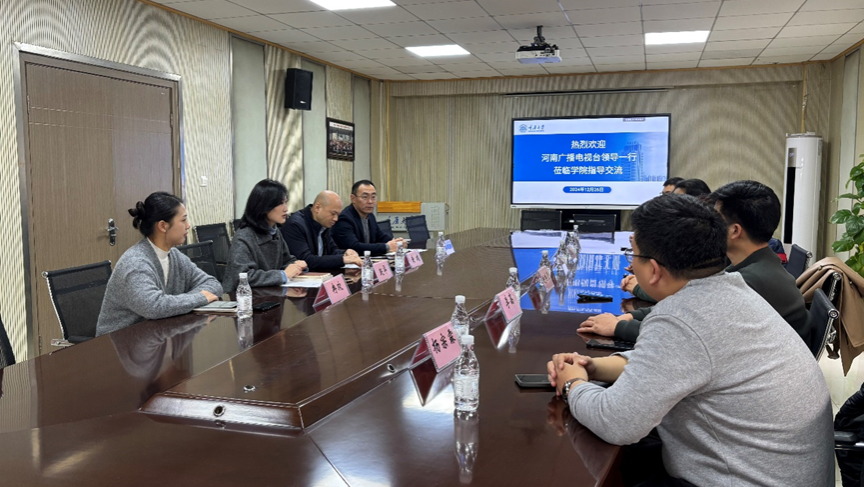 赵华向赵瑞莹总监一行的到来表示热烈欢迎。她围绕专业设置、师资力量、学生规模与就业等方面介绍了学院的基本情况。她表示,学院高度重视人才培养与学生就业工作,不断致力于探索校企合作的新模式、新路径。黄鹏介绍了学院在人才培养、办学定位、专业特色、学生实习实践等方面的情况,就学院与河南广播电视台开展全面深化合作进行了展望与可行性分析。