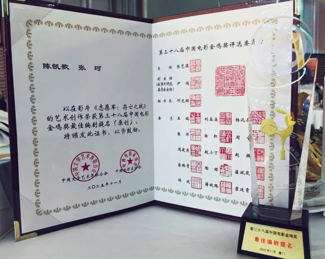 2002级戏文专业、2006级电影学硕士校友张珂在本届金鸡奖中表现亮眼。他与陈凯歌导演共同担任编剧的战争史诗巨制《志愿军:存亡之战》荣获了金鸡奖评委会特别奖,同时二人也凭借此片获得了最佳编剧提名。