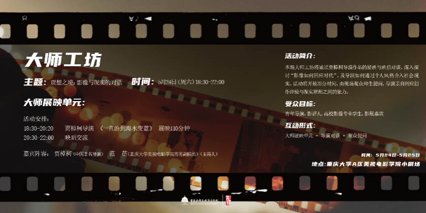 2025年5月24日,第六届先锋艺术电影展“大师工坊”交流活动在重庆大学美视电影学院小剧场顺利举办。著名导演、电影教育家贾樟柯应邀莅临重庆大学美视电影学院小剧场出席第六届先锋艺术电影展“大师工坊”交流活动,活动由美视电影学院常务副院长范蓓主持。现场放映了贾樟柯导演作品《一直游到海水变蓝》。贾樟柯导演结合其三十多年电影创作经历,与在场师生深入探讨了地缘记忆、创作方法、技术哲学与艺术本体等多个核心议题。