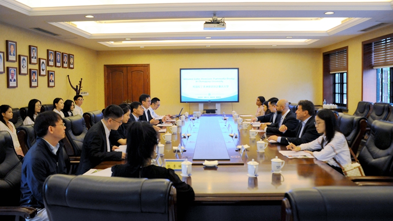 2024-11-15 近日,拉美驻华使节代表团一行到访重庆大学,与我校师生交流座谈。代表团成员包括萨尔瓦多驻华大使路易斯·洛佩斯、参赞宝拉·卡瓦列罗,哥伦比亚驻华大使馆公使衔参赞圣地亚哥·甘博亚,以及古巴驻华大使馆三等秘书黛娜丽。重庆市人民政府外事办公室美大处干部霍一雪、程柯乔陪同来访。重庆大学美视电影学院党委书记李阳模、院长助理王琦、文学系副教授罗显勇、播音与主持系副教授张李楠,国际合作与交流处副处长高翔,以及美...